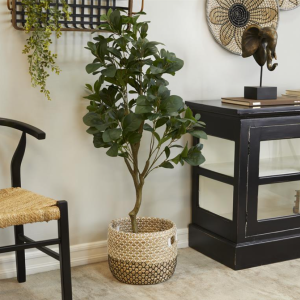 Plante artificielle de style naturel mettant en valeur une forme d’arbre et un récipient cylindrique.