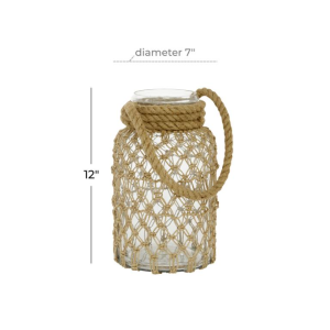 d’accents en corde avec un motif de maille de diamant. La lanterne comprend un cintre en corde épaisse qui supporte le support en verre transparent.
