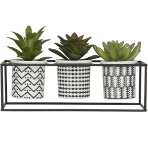 Plante artificielle succulente à faux feuillage vert avec des pots tribaux à l'intérieur du support en métal noir